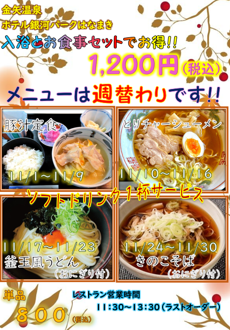 投稿日: 2025年10月30日2025年11月4日 投稿者: はなまき金矢温泉11月・入浴とお食事セット 11月・入浴とお食事セット 入浴とお食事がセットで1,200円(税込)のお得なプランです ※メニューは週替わりとなります 【メニューの詳細】 11月ランチ入浴セットダウンロード