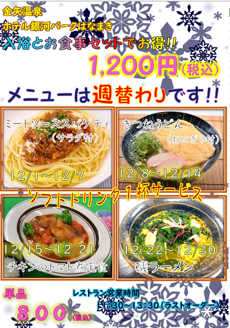 投稿日: 2025年11月28日 投稿者: はなまき金矢温泉12月・入浴とお食事セット 12月・入浴とお食事セット 入浴とお食事がセットで1,200円(税込)のお得なプランです ※メニューは週替わりとなります 【メニューの詳細】 12月ランチ入浴セットダウンロード