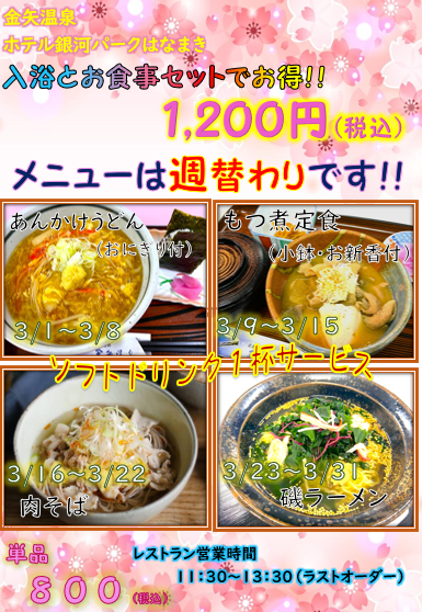 投稿日: 2026年2月24日2026年2月24日 投稿者: はなまき金矢温泉3月・入浴とお食事セット 3月・入浴とお食事セット 入浴とお食事がセットで1,200円(税込)のお得なプランです ※メニューは週替わりとなります 【メニューの詳細】 3月ランチ入浴セットダウンロード